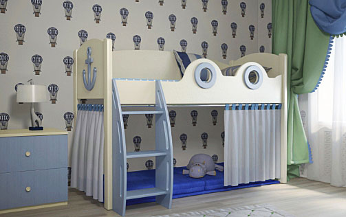 Интересный дизайн кровати чердака «Морячок» украсит тематическую детскую комнату в морском стиле. Общая тематика кровати с детской комнатой окунут ребенка в мир путешествий и разовьют его фантазию.